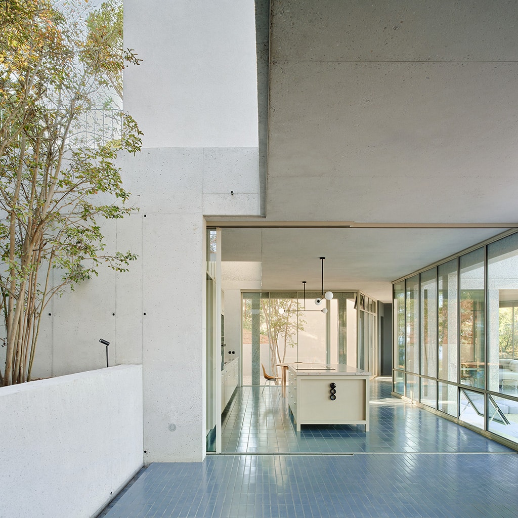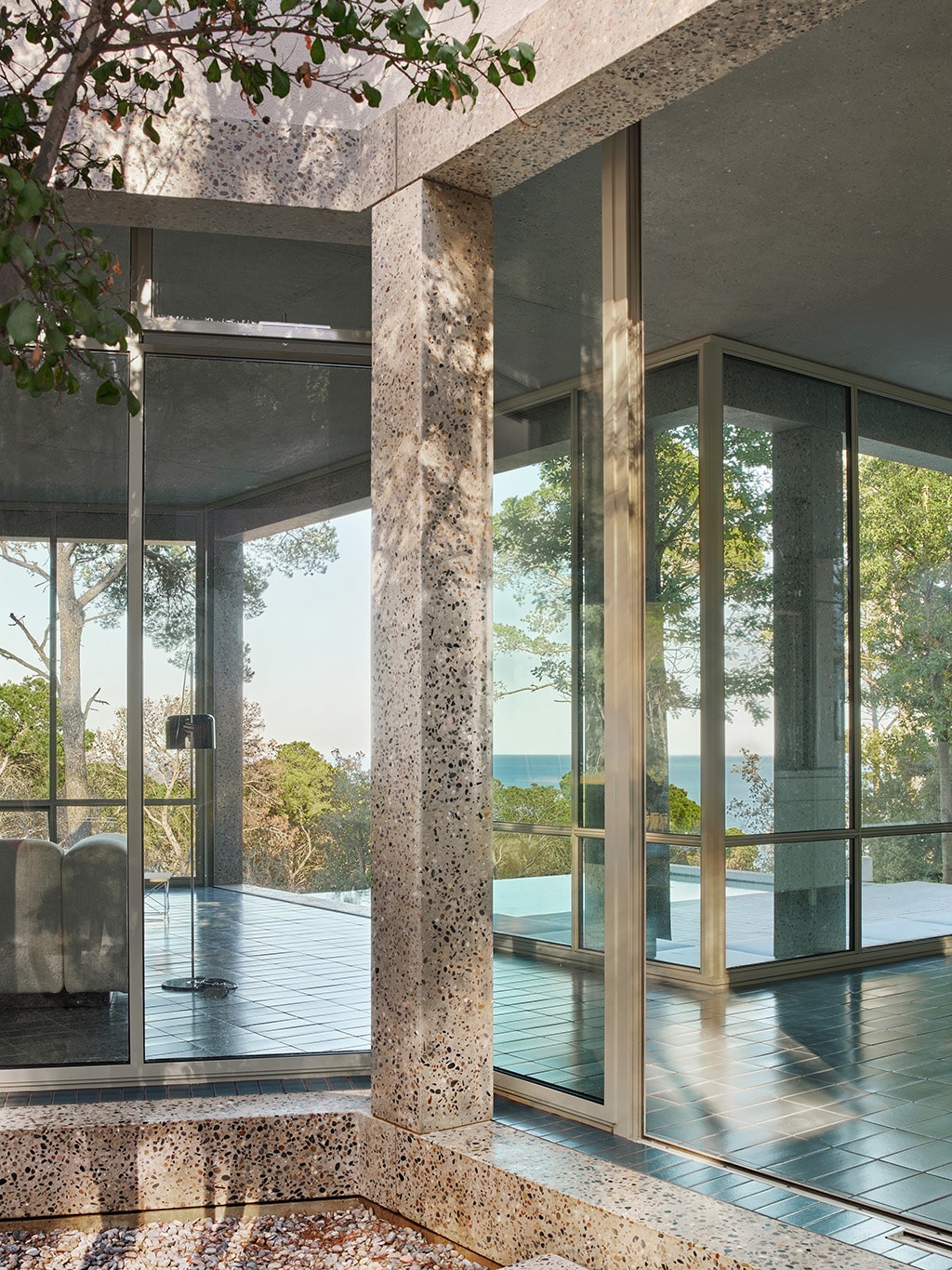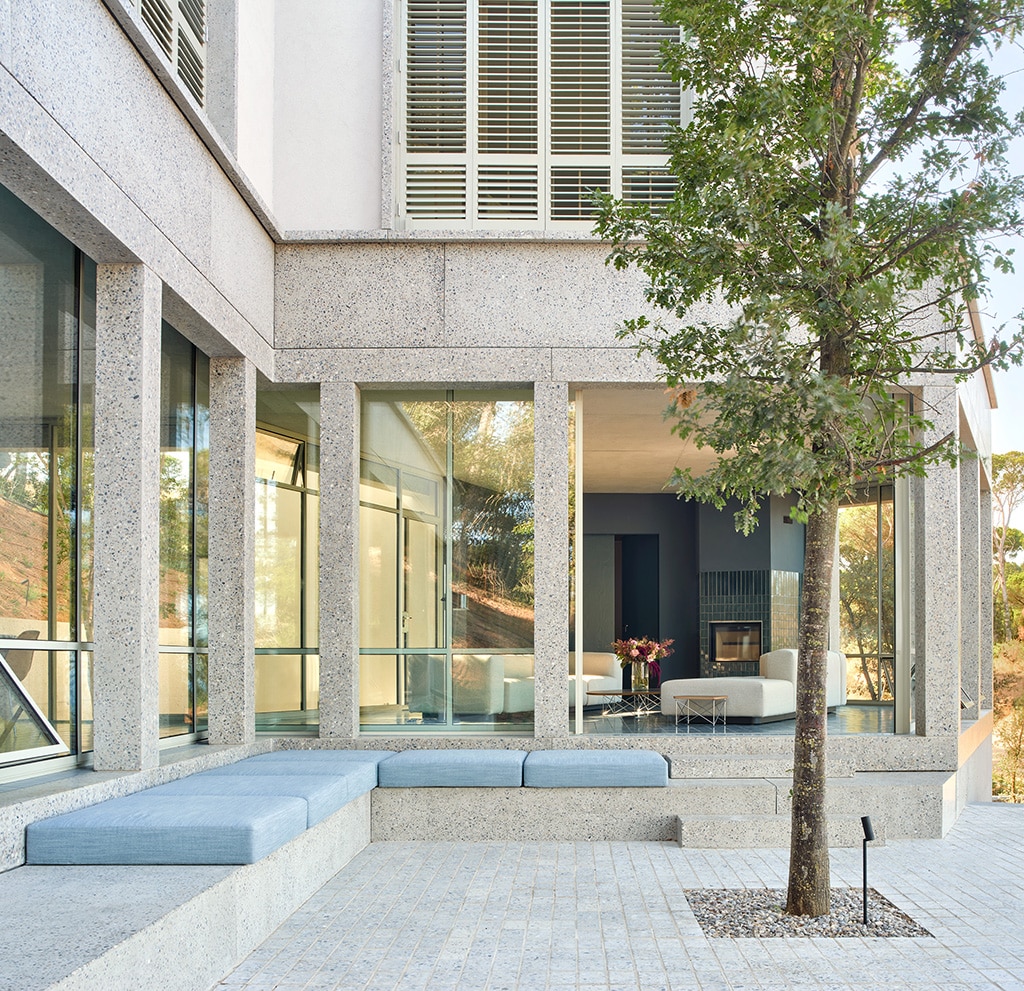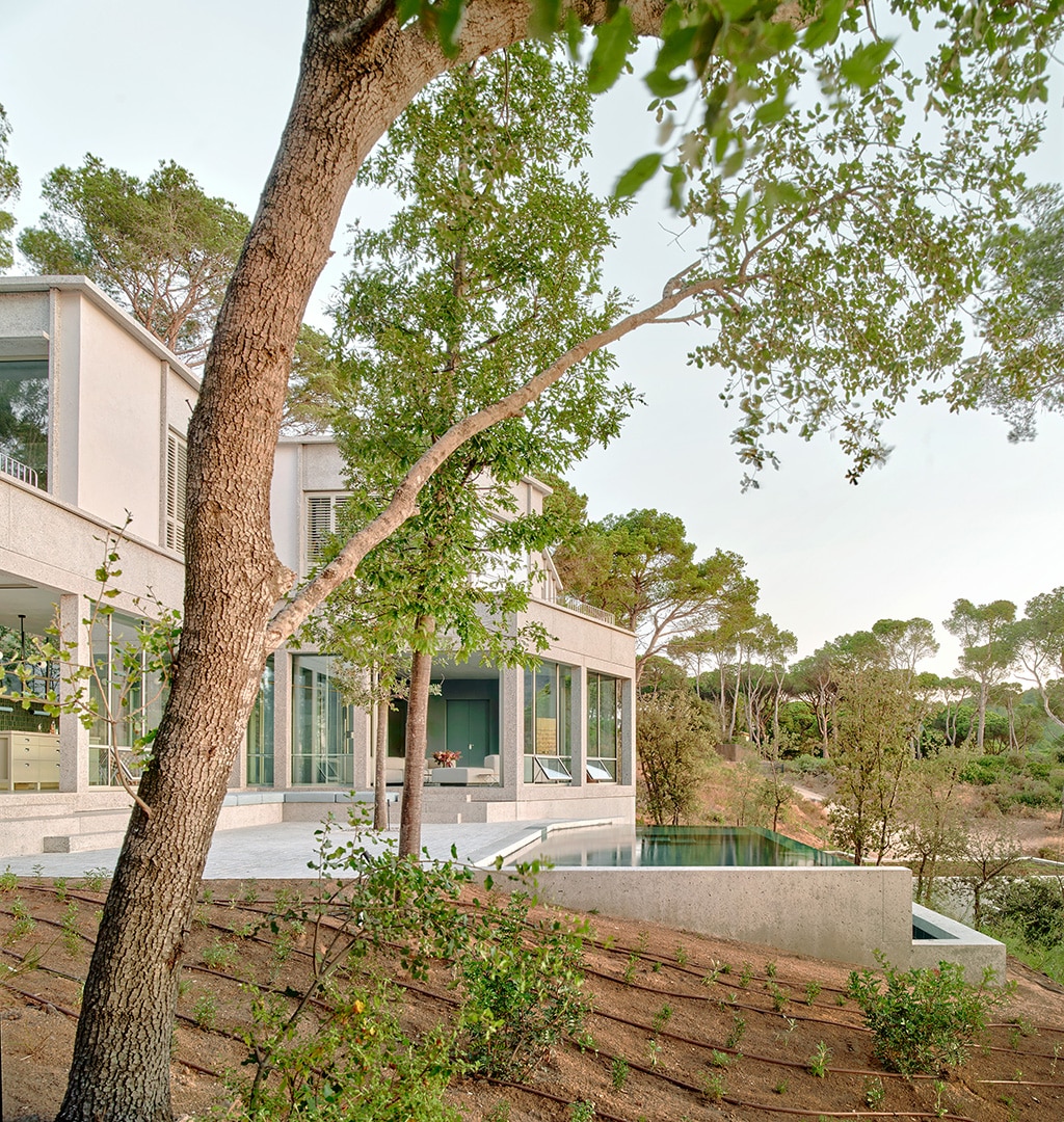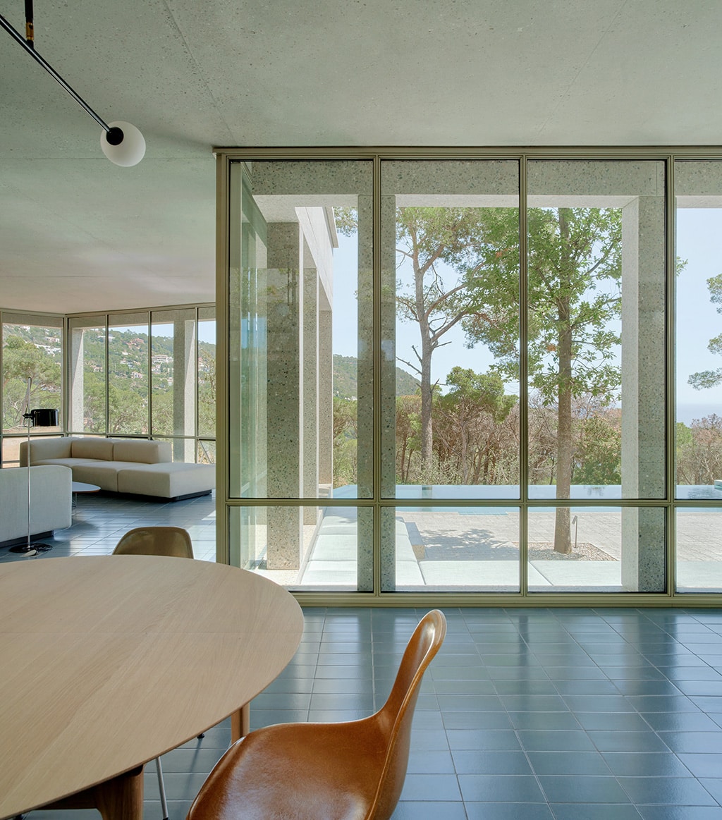 El proyecto se articula a partir de un pórtico de columnas y vigas de hormigón pulido que ordena los espacios principales de la vivienda. Esta estructura genera una continuidad absoluta entre el interior y los ámbitos exteriores en sombra, permitiendo que la vida fluya sin barreras hacia el espacio abierto y la piscina. Cada estancia ha sido diseñada para disfrutar de vistas privilegiadas al mar Mediterráneo, convirtiendo el paisaje en un elemento arquitectónico más.